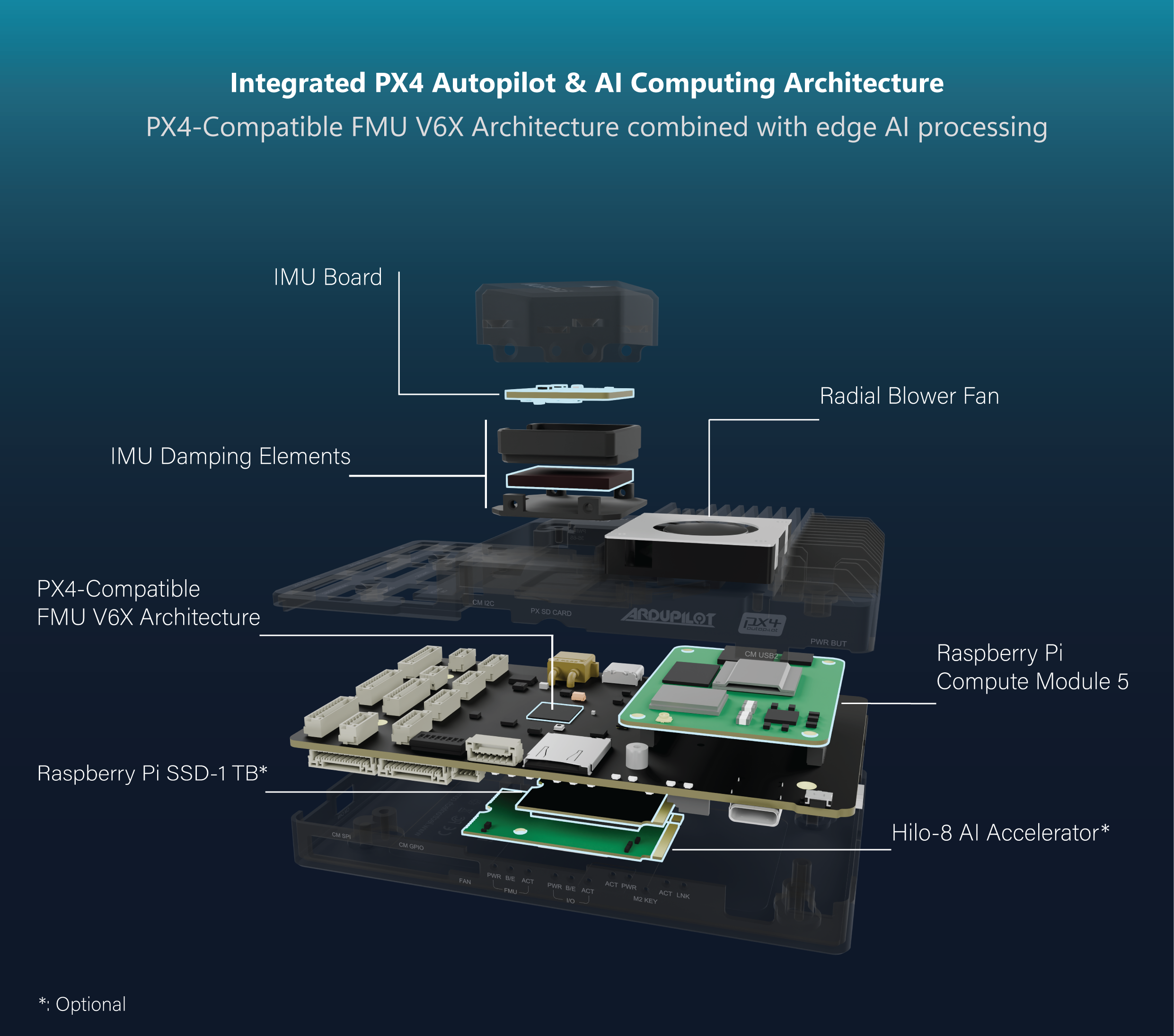 Optional Hailo-8 (26 TOPS) AI accelerator integrated with Raspberry Pi Compute Module 5 enables onboard perception, real-time vision processing, and mission-level autonomy.